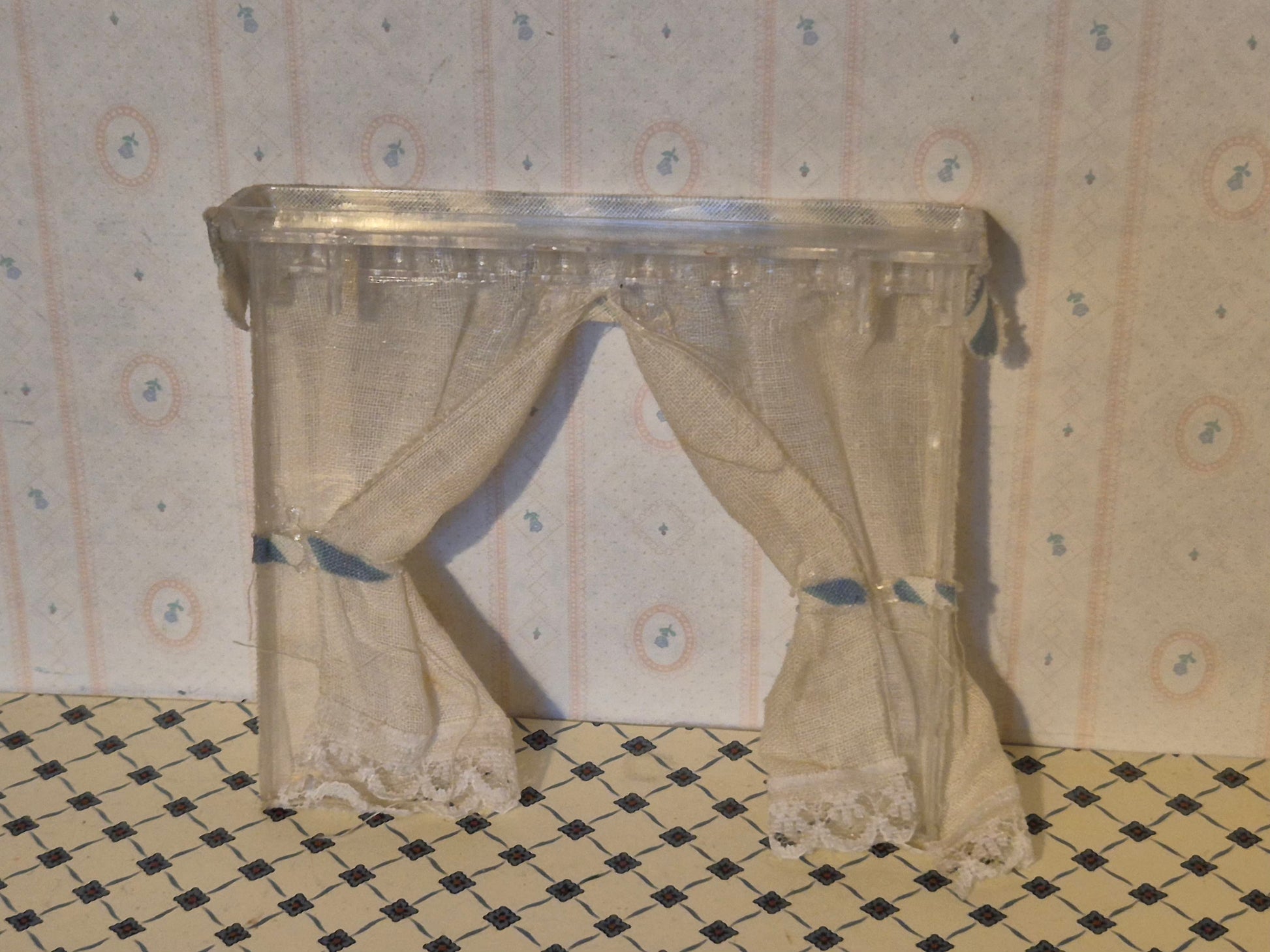Rigtig pænt vintage Lundby gardin i hvidt og lyseblåt. Udmærket stand, intakt, med patina og brugsspor, lidt slid / solbleget.