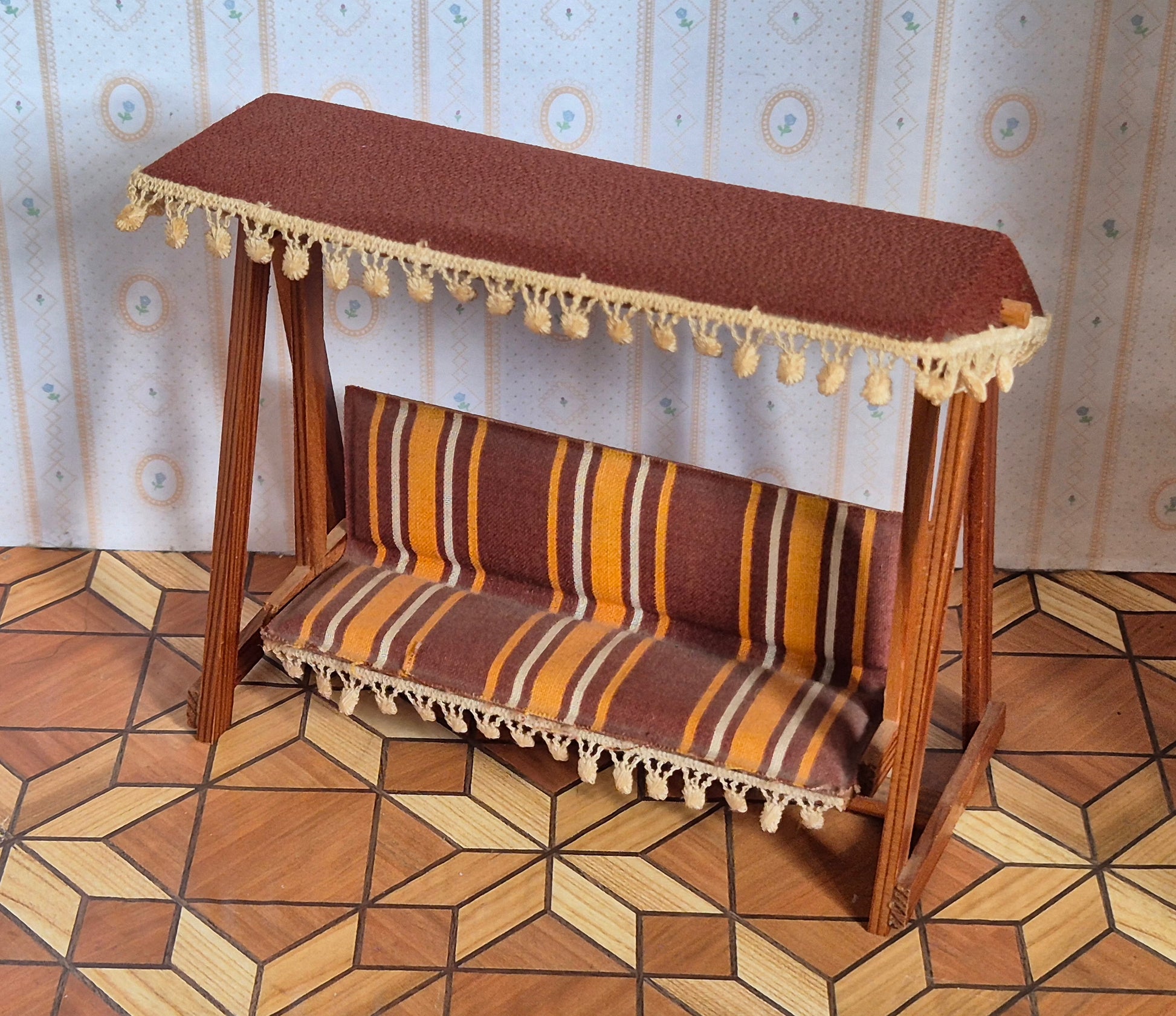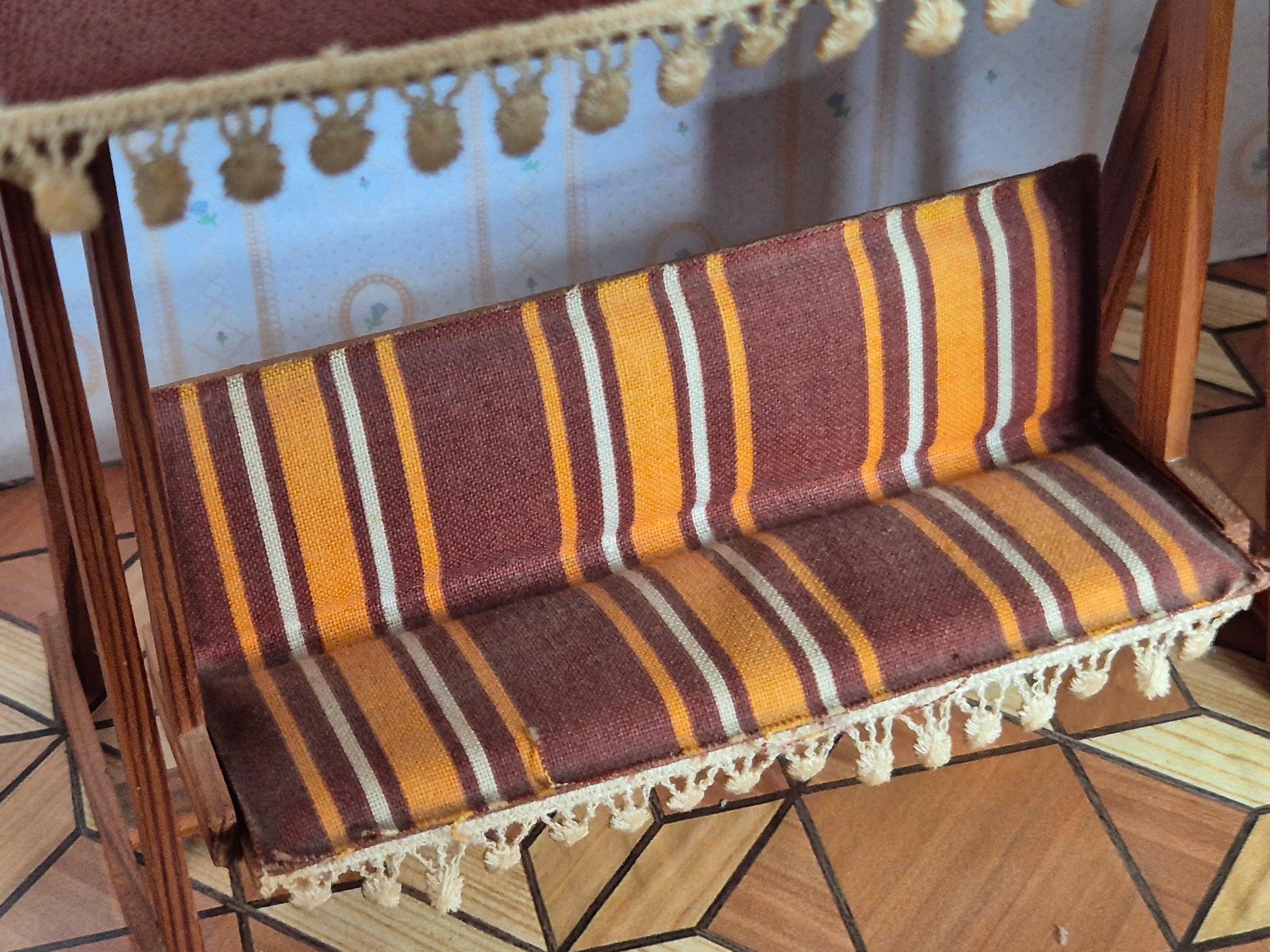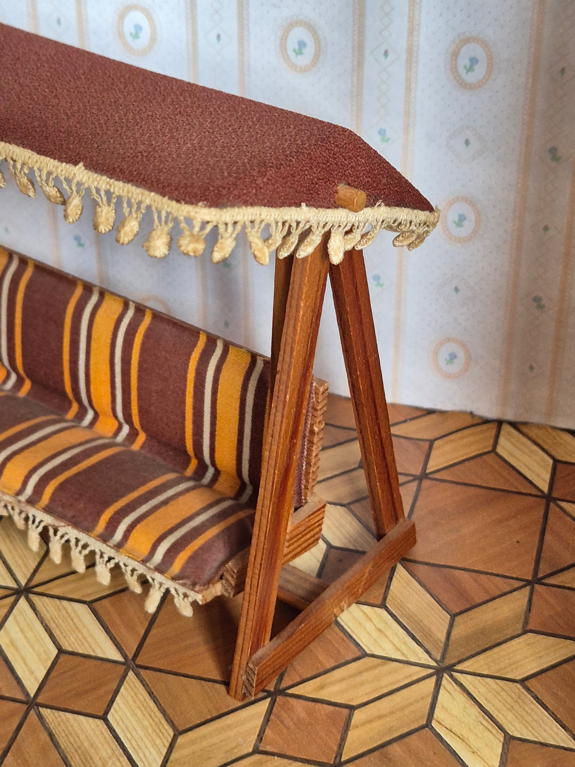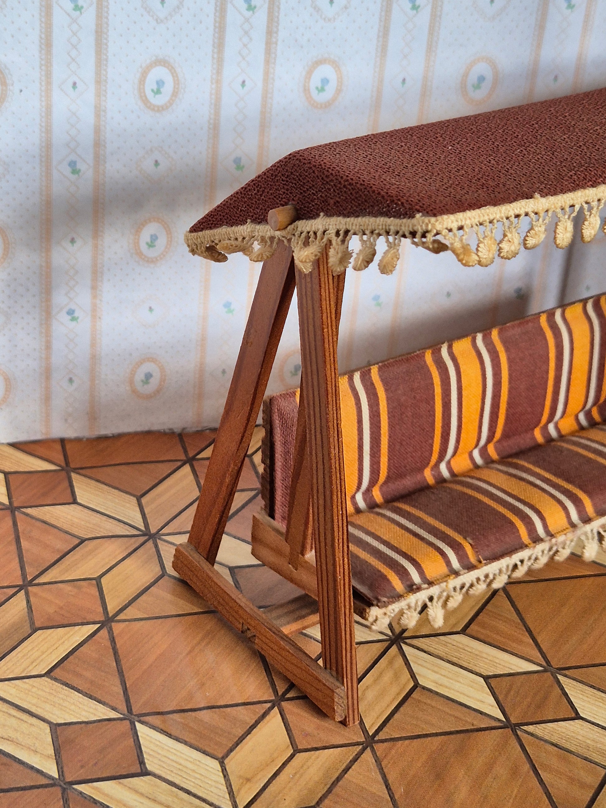 Lundby havemøbel - sofagynge i retro design. Den er pæn og ældre. Den er limet, lidt løs og skæv nogle steder. Patina og brugsspor må forventes.