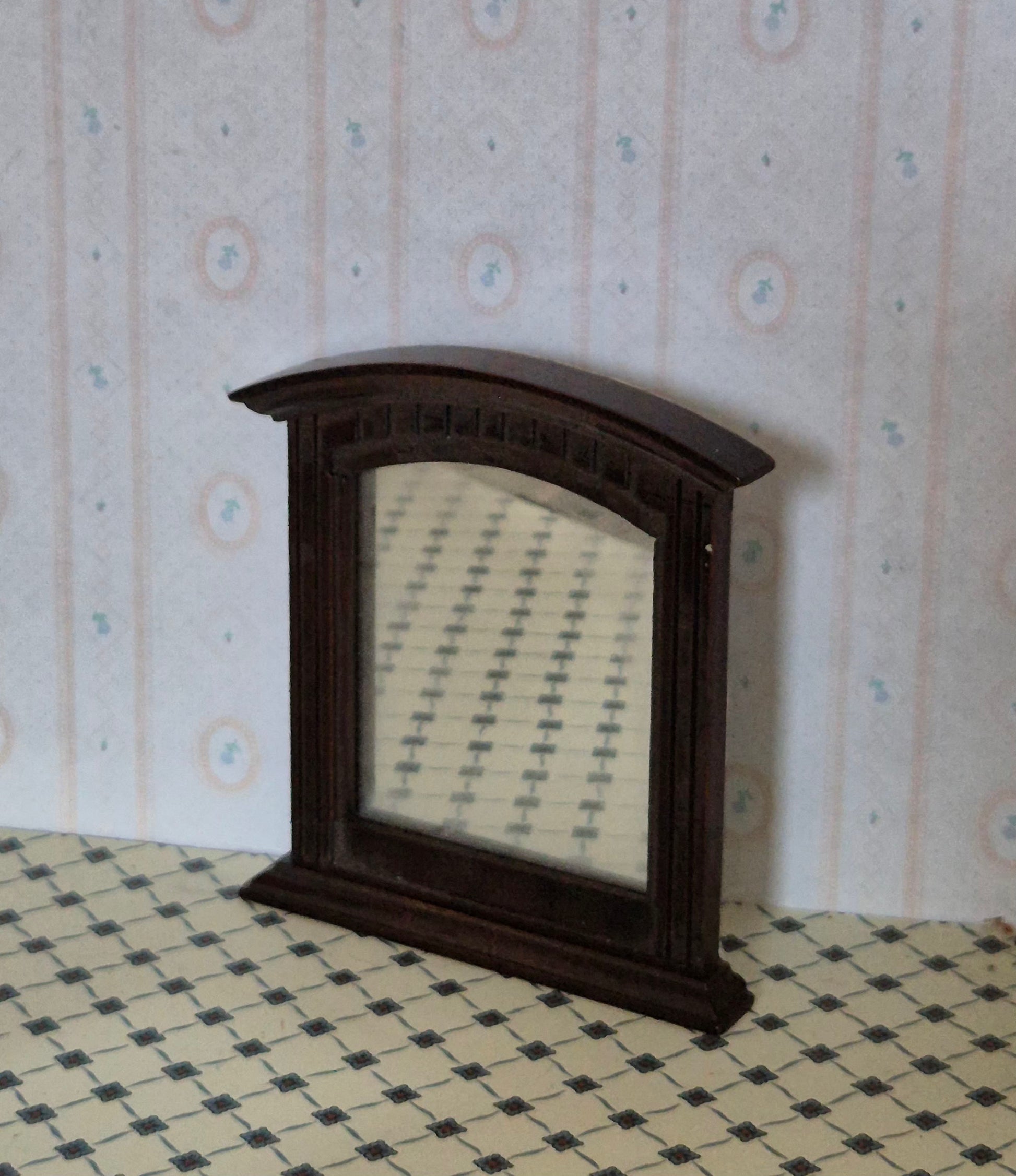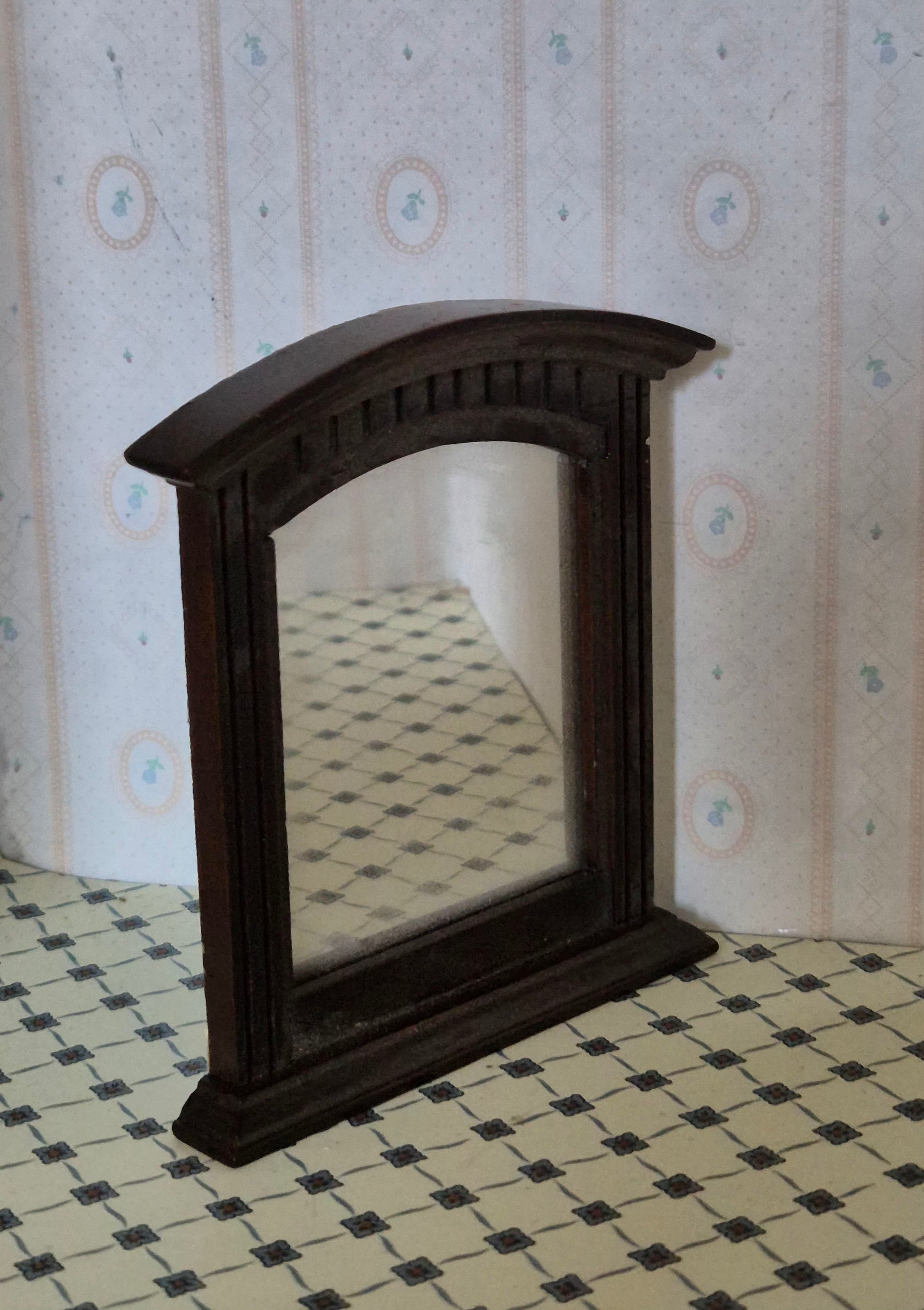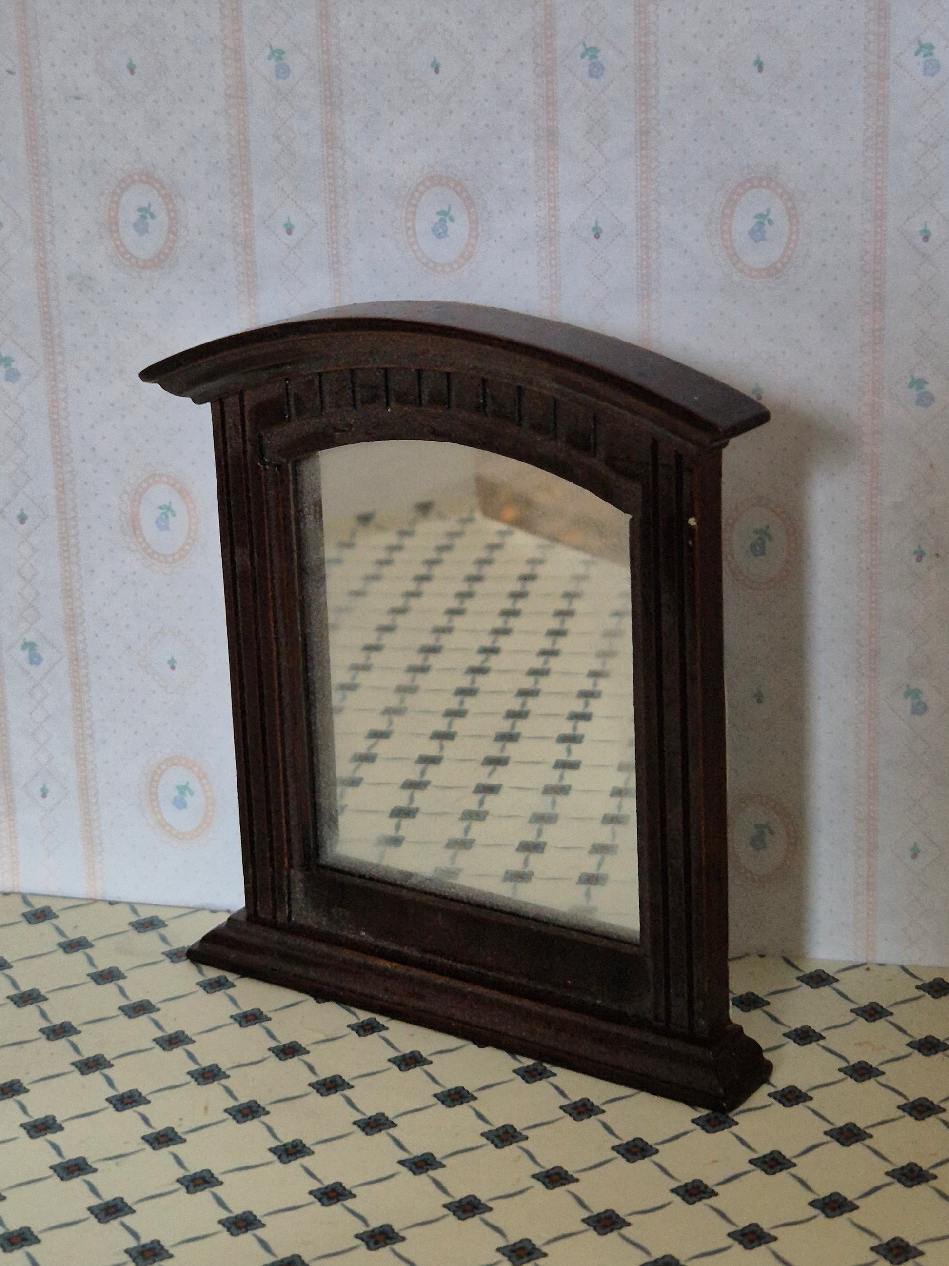 Pæn spejl med buet træ ramme i brun. Udmærket stand med patina og brugsspor. Den passer bedst til 1:12 - 1:10.