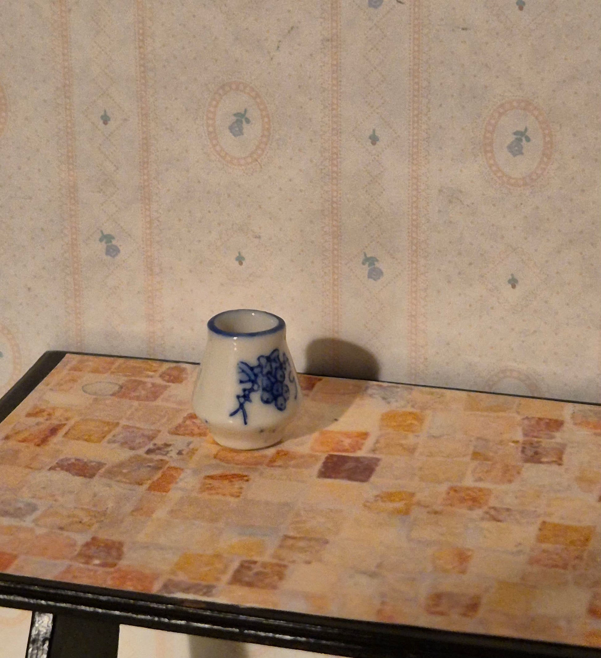 Pæn vase af porcelæn med blåt mønster. Den er ca 1,5 cm høj.